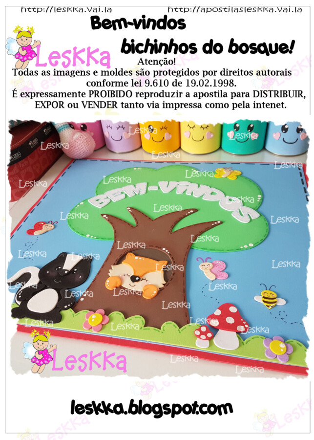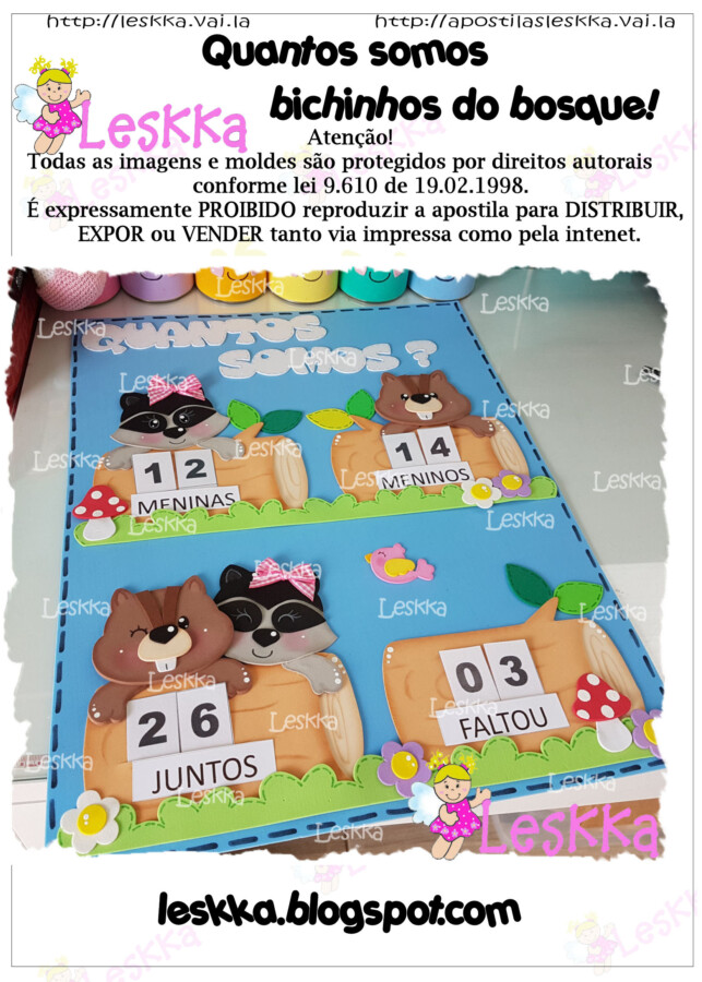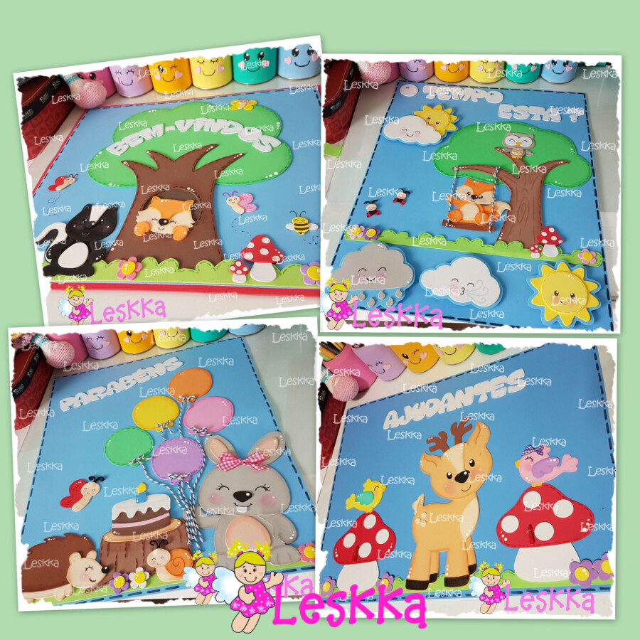 Combo em pdf com 14 páginas com 4 apostilas de moldes para fazer cartazes escolares no tema BICHINHOS DO BOSQUE.