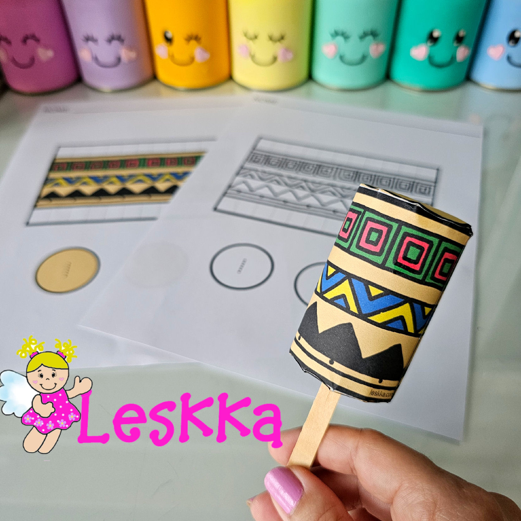 Arquivo com 2 páginas (colorido e para colorir) para montar um maracá com rolinho de papel e palitos