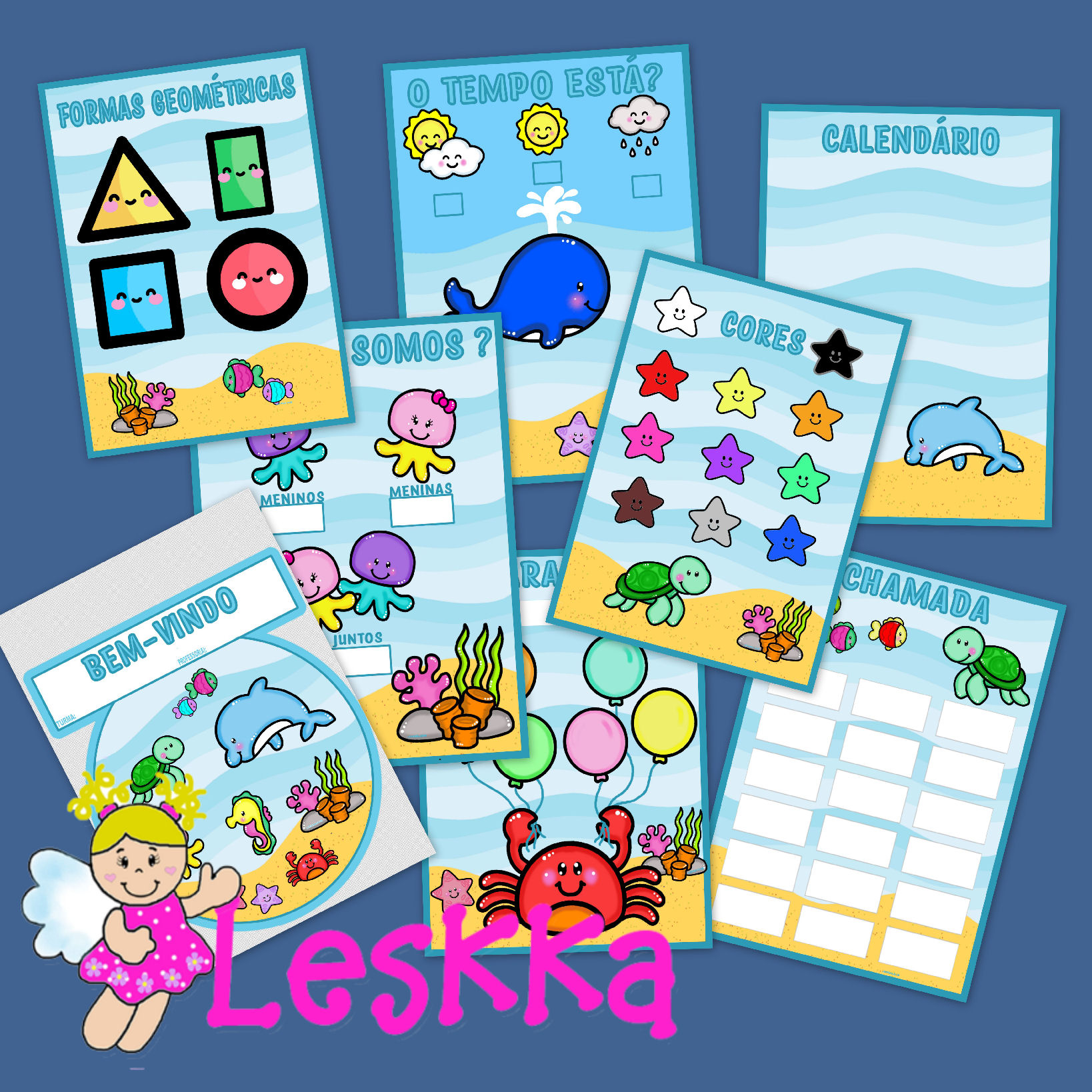 Arquivo digital colorido com 32 páginas em pdf para imprimir, recortar e montar 7 cartazes e 1 placa no tema fundo do mar.