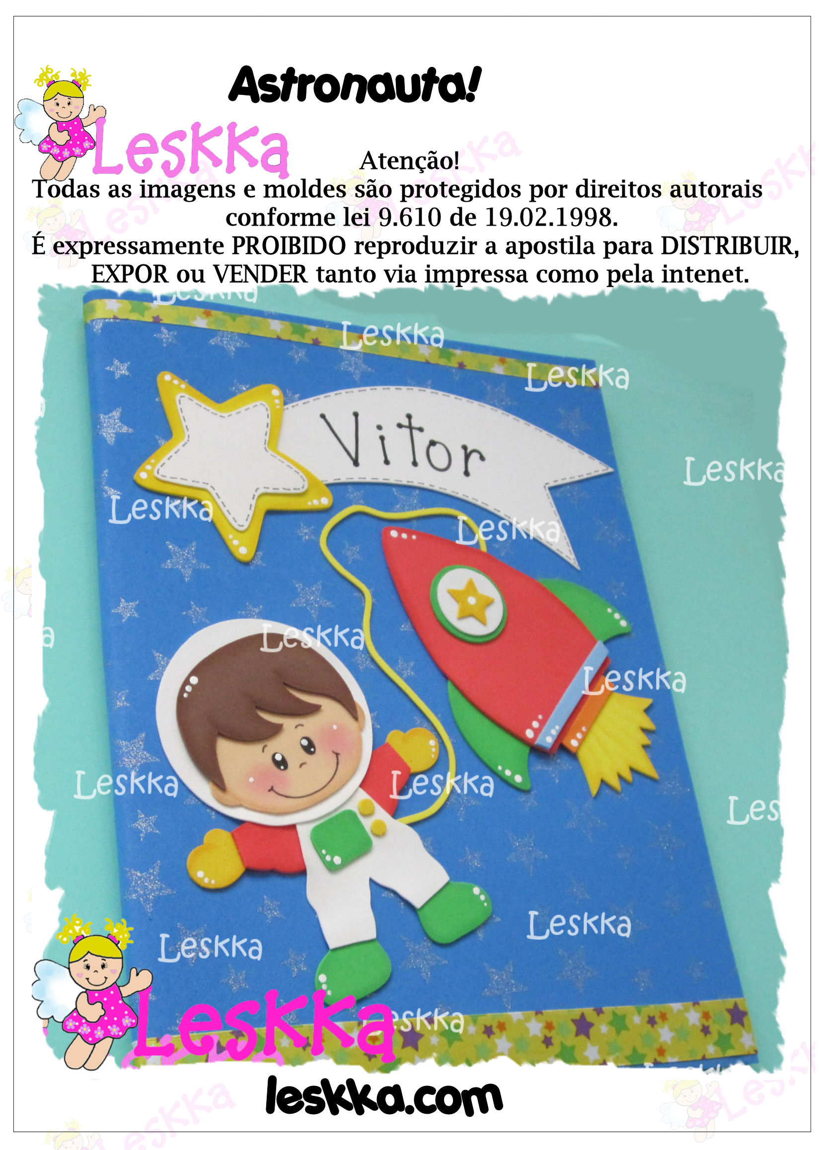Arquivo pdf com 3 páginas com moldes para fazer o astronauta para colocar em pasta e cadernos