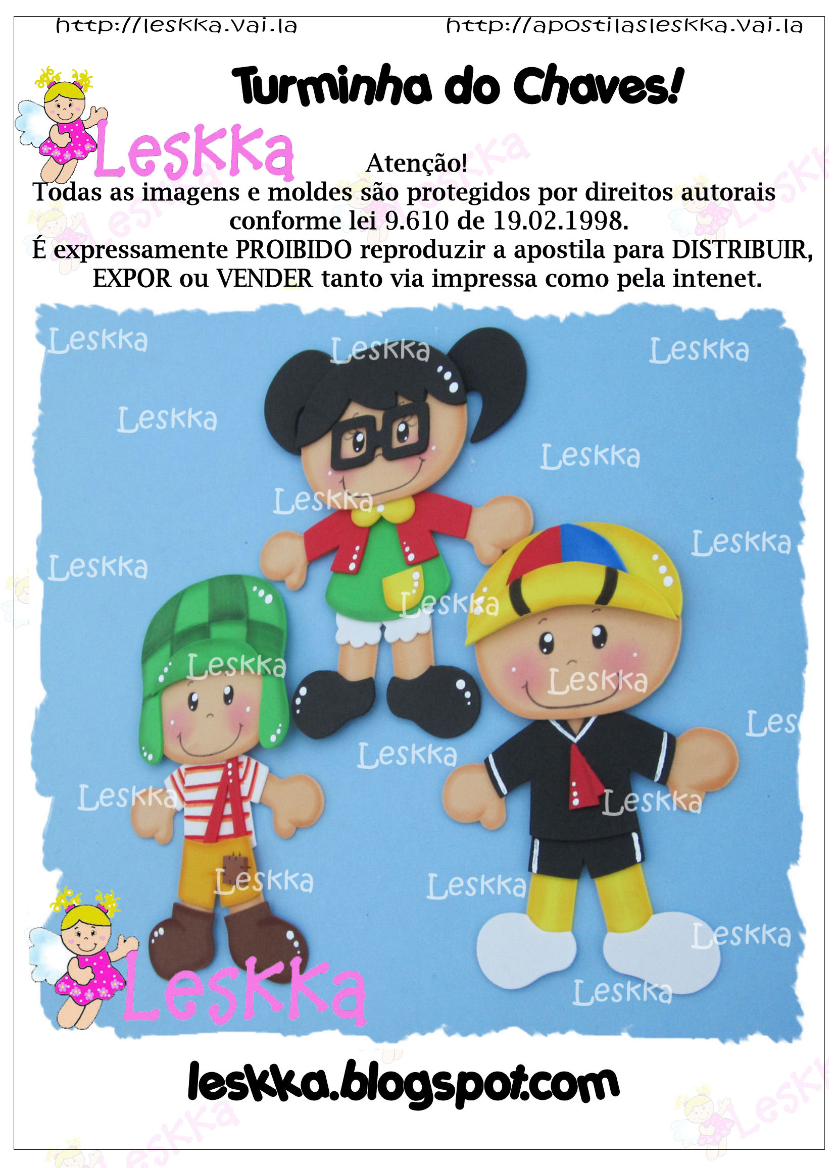 Arquivo pdf com 11 páginas para fazer o Chaves, Chiquinha e Kiko em dois tamanhos (15cm para fazer capas e 43cm para fazer mural).