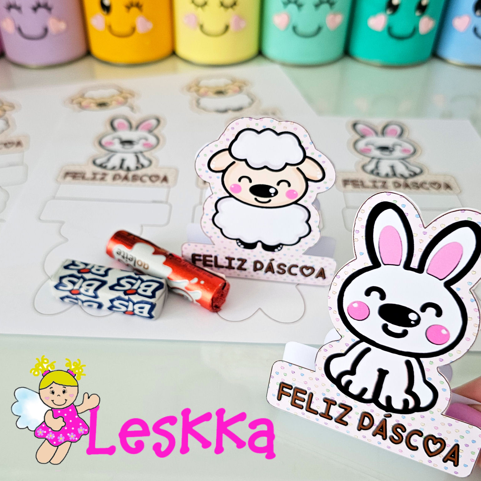 Arquivo digital com 2 páginas com coelhinho ne cordeirinho (3 unidades na folha) em pdf.